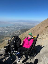 - Emily Traveller poses for a photo in a mobility device after a a hike of Mount Timpanogos on Saturday, Sept. 14, 2024.