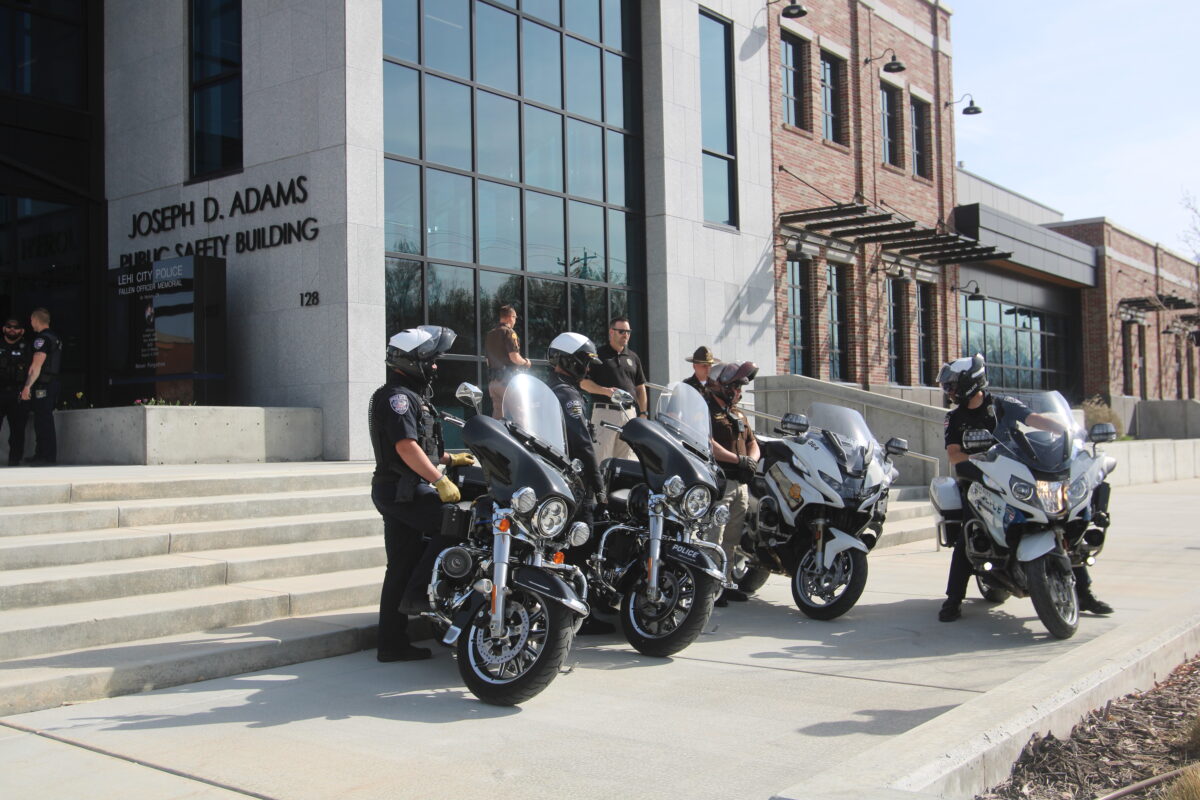 - Police officers from various agencies sit on their motorcycles following a news briefing outside the Lehi Public Safety building on Tuesday, April 8, 2025.