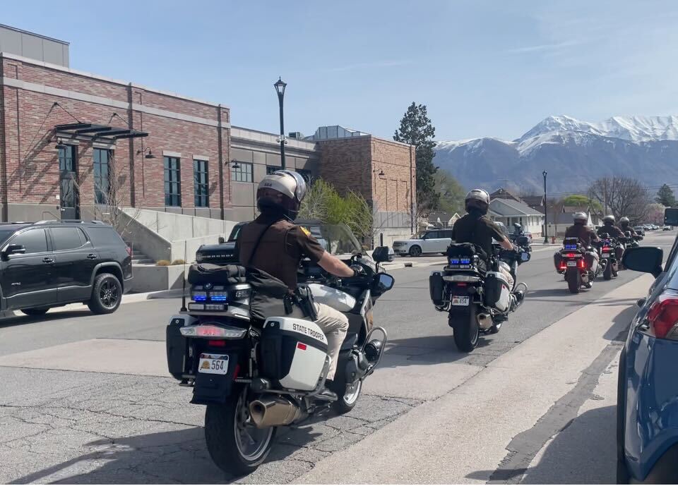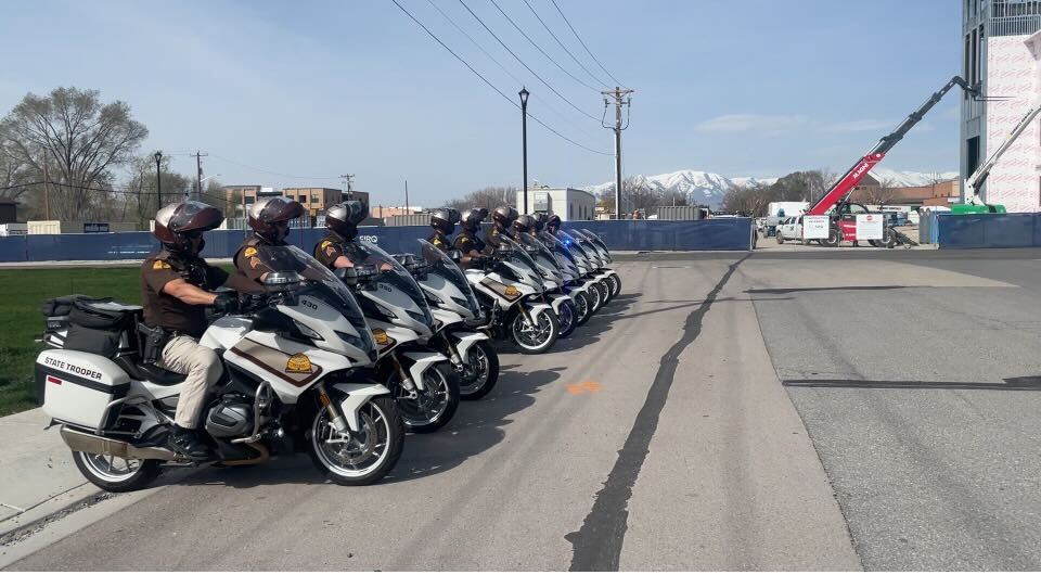 - Utah Highway Patrol state troopers ride off in unison following a news briefing outside the Lehi Public Safety building on Tuesday, April 8, 2025.