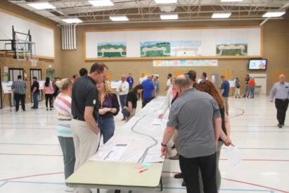 - Community members view a map of proposed construction during an open house public hearing Wednesday, April 9, 2025, at Snow Springs Elementary School in Lehi. The Utah Department of Transportation is planning to install flex lanes along Pioneer Crossing to reduce east-west traffic congestion.
