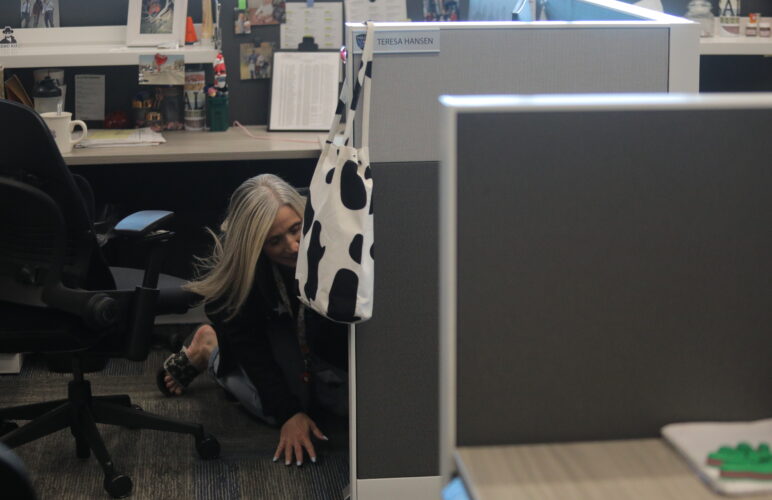City employee Teresa Hansen gets under her desk as part of the 2023 Great Utah ShakeOut earthquake drill at the Adams Public Safety Building in Lehi on Thursday, April 20, 2023.Drop, cover and hold on.
