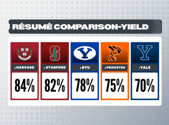 Data recently released from the National Center for Education Statistics show that when it comes to yield rate — the percentage of admitted students who go on to enroll — BYU is elite. The Cougs’ 78% rate is good enough for No. 5 in the country, placing it just behind Harvard and Stanford and ahead of Princeton and Yale.
