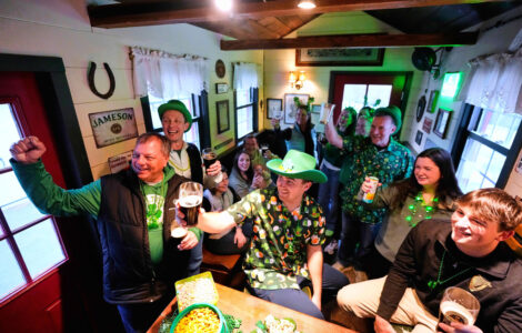 Neighbors packed around the bar as music played and Guinness flowed — inside a miniature pub that ...