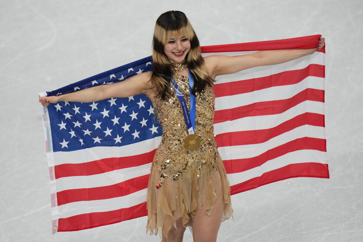 Gold medalist Alysa Liu of the United States celebrates her medal after competing in the women's free skate program in figure skating at the 2026 Winter Olympics, in Milan, Italy, on Thursday, Feb. 19, 2026.