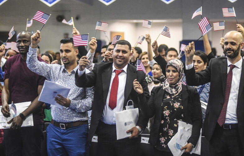 New citizens wave U.S. flags after taking the oath of citizenship during a naturalization ceremony held by the U.S. District Court for the Northern District of Mississippi at Oxford High School in Oxford, Mississippi, on Friday, May 10, 2019. Over 100 people from 44 countries took the oath. (Bruce Newman/The Oxford Eagle via AP)