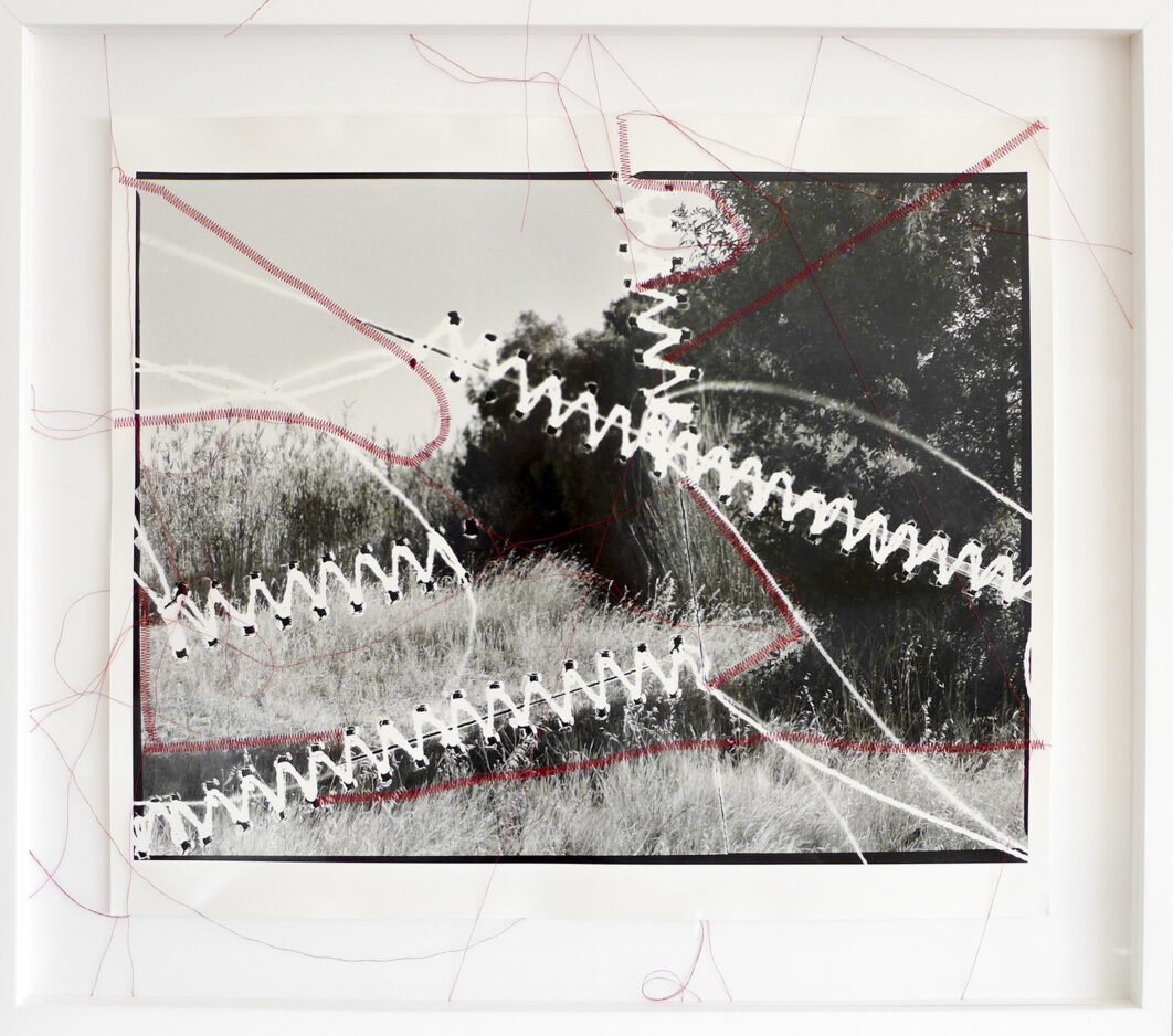 Odette England’s stitched photographs convey an emotional and physical connection to land that has been disrupted by familial displacement. Her work, stitched by both her and her mother, weaves together fragments of memory and place, symbolizing the loss of home and the yearning to belong.