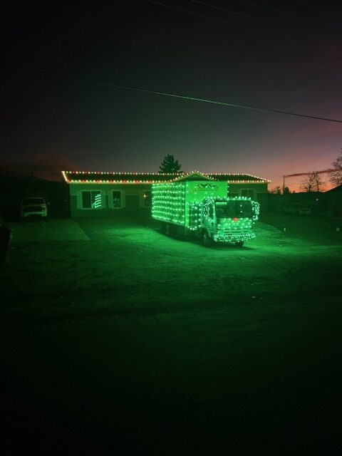 - A large truck and trailer glow bright green after dark, fully wrapped in Christmas lights at a home near 240 East 100 South in Mount Pleasant, creating a one-of-a-kind holiday display that has caught the attention of passersby.