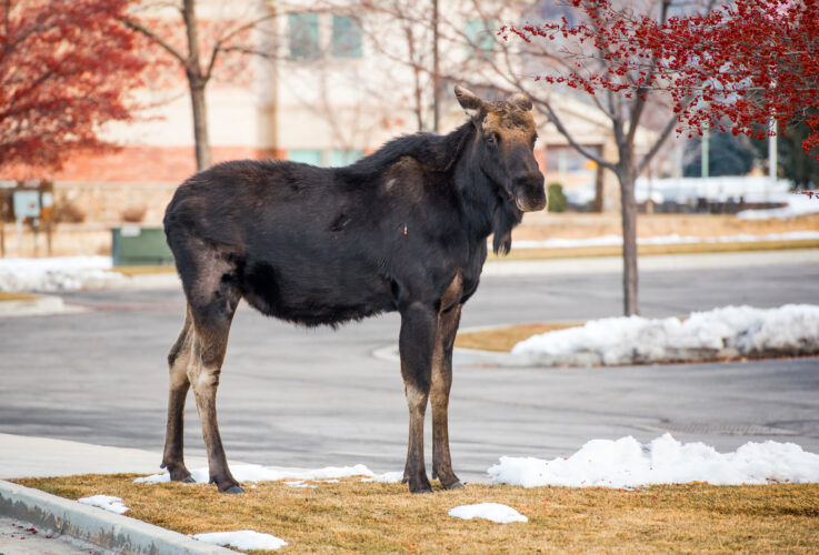 If a moose wanders into a residential or populated area, contact the DWR so it can be safely relocated. Moose can remain in urban areas for long periods and may become aggressive if approached — especially by people with dogs.