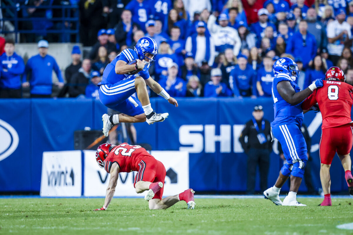 BYU quarterback Bear Bachmeier leaps over Utah defender Jackson Bennee in a Big 12 football game at LaVell Edwards Stadium on Saturday, Oct. 18, 2025.
