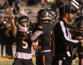 Sweetwyne’s favorite target on Friday was receiver Talmage Oswald, who caught nine passes for 204 yards and three touchdowns. The senior wideout was looked for early and often, leading off the Skyridge scoring with a 13-yard touchdown reception before adding touchdown grabs of 70 and four yards. All three of Oswald’s touchdowns came in the first half as Skyridge built a commanding 35-10 lead at the break.