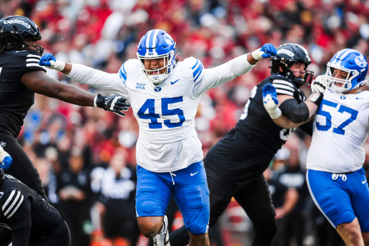 BYU's Villiama Po'uha (45) celebrates a sack against Iowa State in a Big 12 football game at Ames, Iowa, on Saturday, Oct. 25, 2025.BYU football beat reporter Brandon Gurney gives his grades for the Cougar’s position group and coaches for Saturday’s 41-27 win over Iowa at Jack Trice Stadium.
