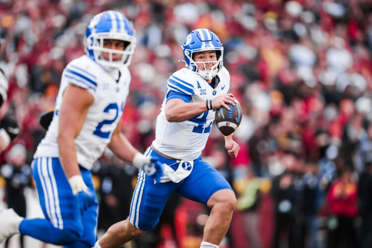 BYU quarterback Bear Bachmeier, right, scrambles against Iowa State in a Big 12 football game at Ames, Iowa, on Saturday, Oct. 25, 2025.Cougar quarterback Bear Bachmeier began his postgame interview session providing perhaps his most controversial comment to date, making an assertion almost no one in their right mind would agree with.