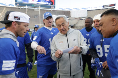 - Former BYU offensive coordinator Norm Chow instructs players during the Cougar’s alumni game on Friday. April 3, 2026