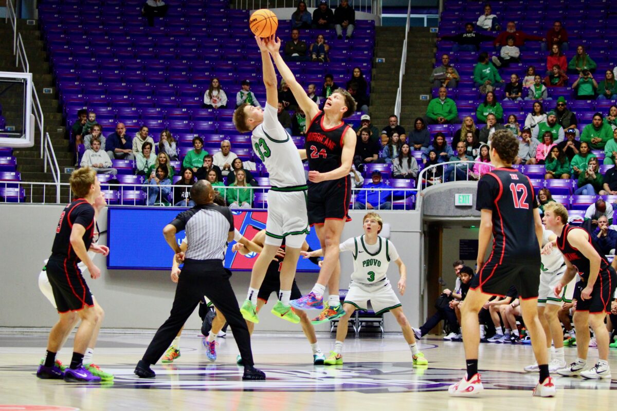- Provo High’s Callen Tollestrup, left, and Hurricane’s Clyde Berrett, right, get things started at the UHSAA 4A boys basketball state championship on Saturday, Feb. 21, 2026, at the Dee Events Center at Weber State University in Ogden.