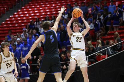- Wasatch forward JJ Serre rises for a shot during his team’s 66-58 loss to Pleasant Grove during the 5A quarterfinal round. February 23, 2026