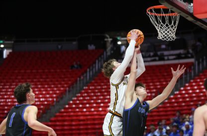 Wasatch and Pleasant Grove battle for a rebound during quarterfinal action at the Hunstman Center on Monday. February 23, 2026