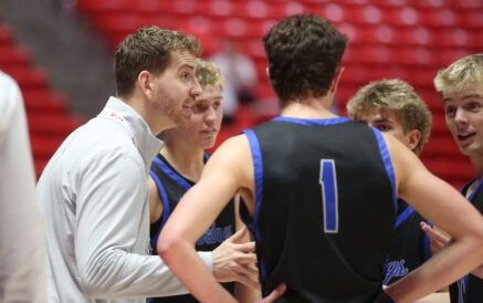 - Pleasant Grove coach Carsen Williams instructs his team during a timeout during 5A state quarterfinal action on Monday. February 23, 2026
