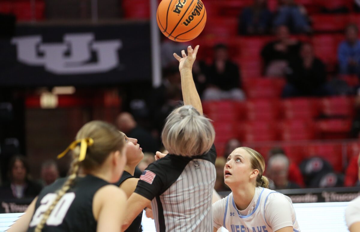 Westlake and Lone Peak contest for the opening tip to kick off 6A state semifinal action at the Huntsman Center on Thursday. February 26, 2026