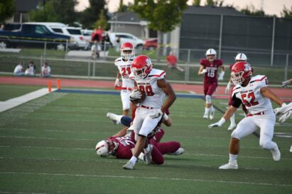 American Fork’s Bodie Schoonover (28) evades Herriman defenders after intercepting a pass during a game against Herriman on Thursday, Sept. 6, 2018.