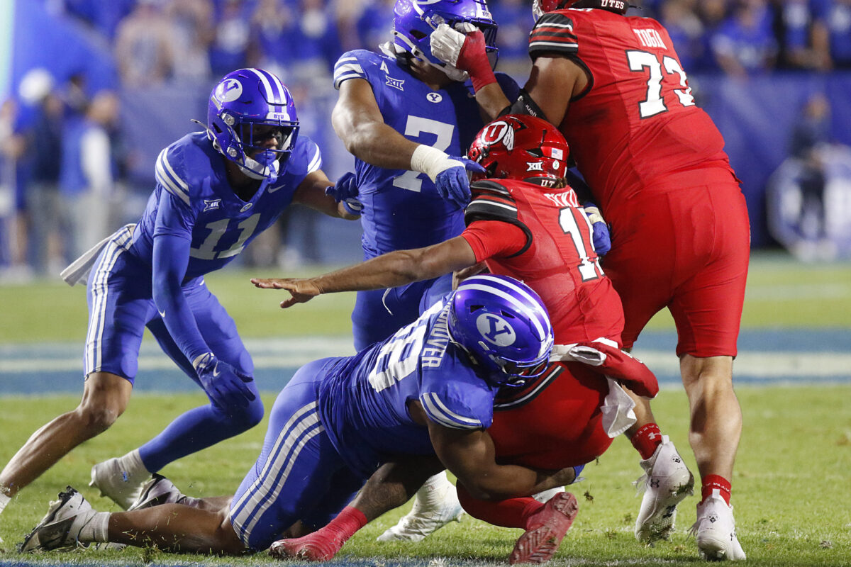 - BYU’s Bodie Schoonover tackles Utah quarterback Byrd Ficklin in a Big 12 football game at LaVell Edwards Stadium on Saturday, Oct. 18, 2025.