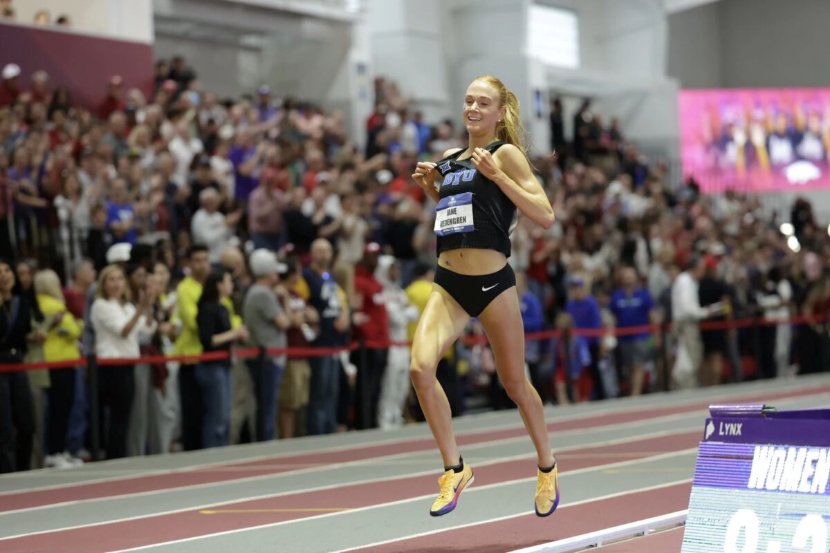 Jane Hedengren finishes her 3,000 meter race with a smile as she sets an NCAA record with her time. March 14, 2026