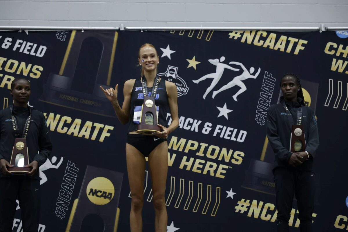 BYU’s Jane Hedengren stands at the victory podium, flashing her first place trophy for her 3,000 meter championship win. March 14, 2026