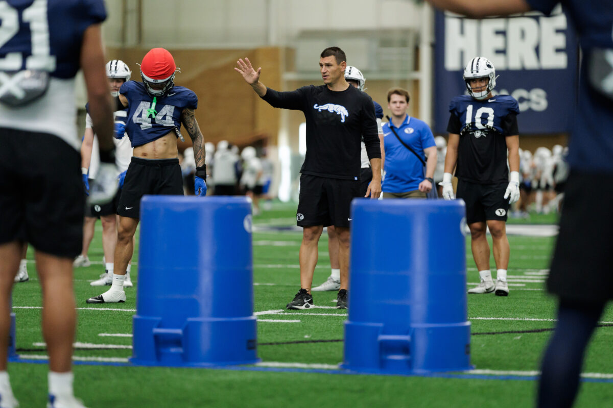 - new BYU defensive coordinator Kelly Poppinga instructs players during a drill during spring practices. March 6, 2026