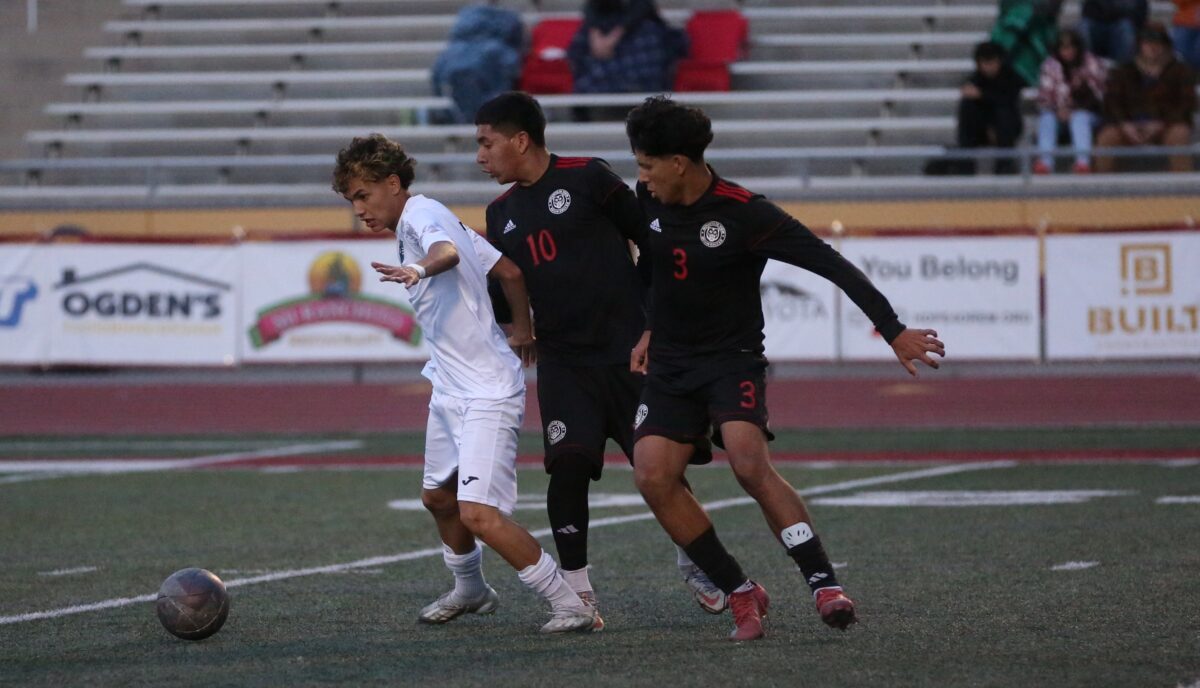 - Provo’s Jurgen Lang protects the ball versus two oncoming defenders during his team’s 3-2 win over Mountain View. March 30, 2026