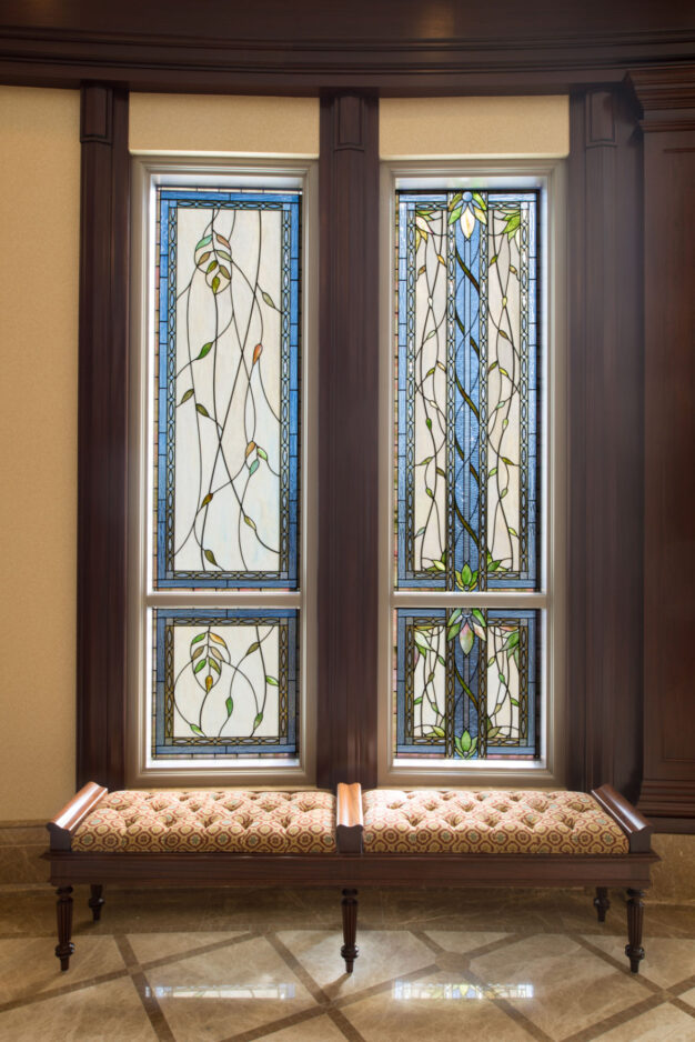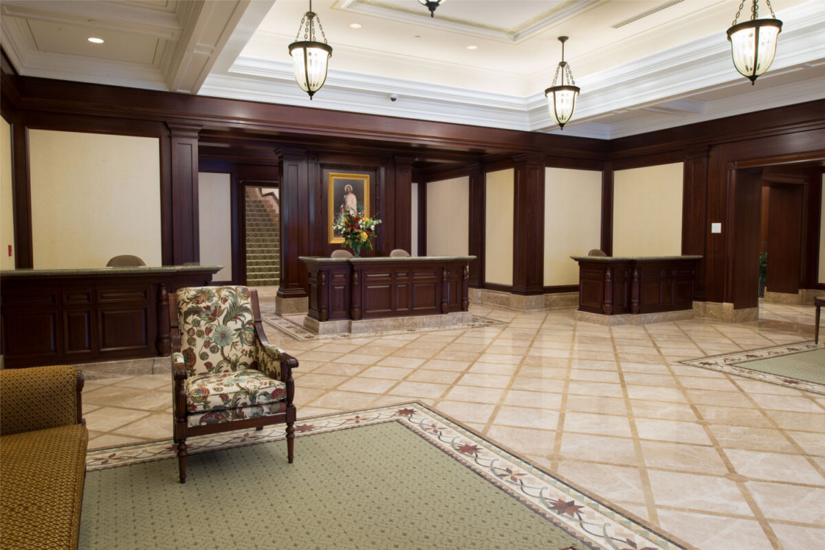 Primarily used by youth of the church to do proxy baptisms for those who have died, the area features a beautiful, small chapel with a window looking out on the baptismal fount. Two confirmation rooms are across the hall with inset art glass.