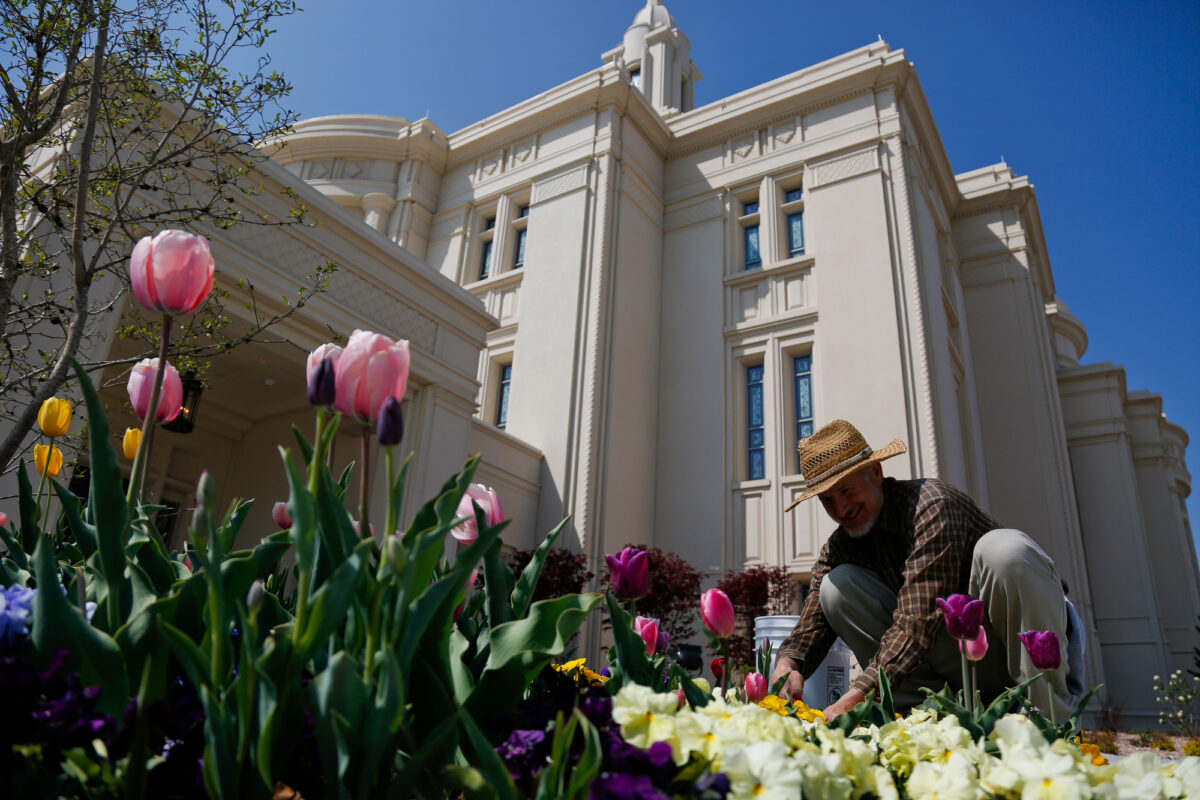 The temple grounds feature raised flower gardens, small patches of lawn and xeriscaping rock gardens with wheat grass and other indigenous plants.