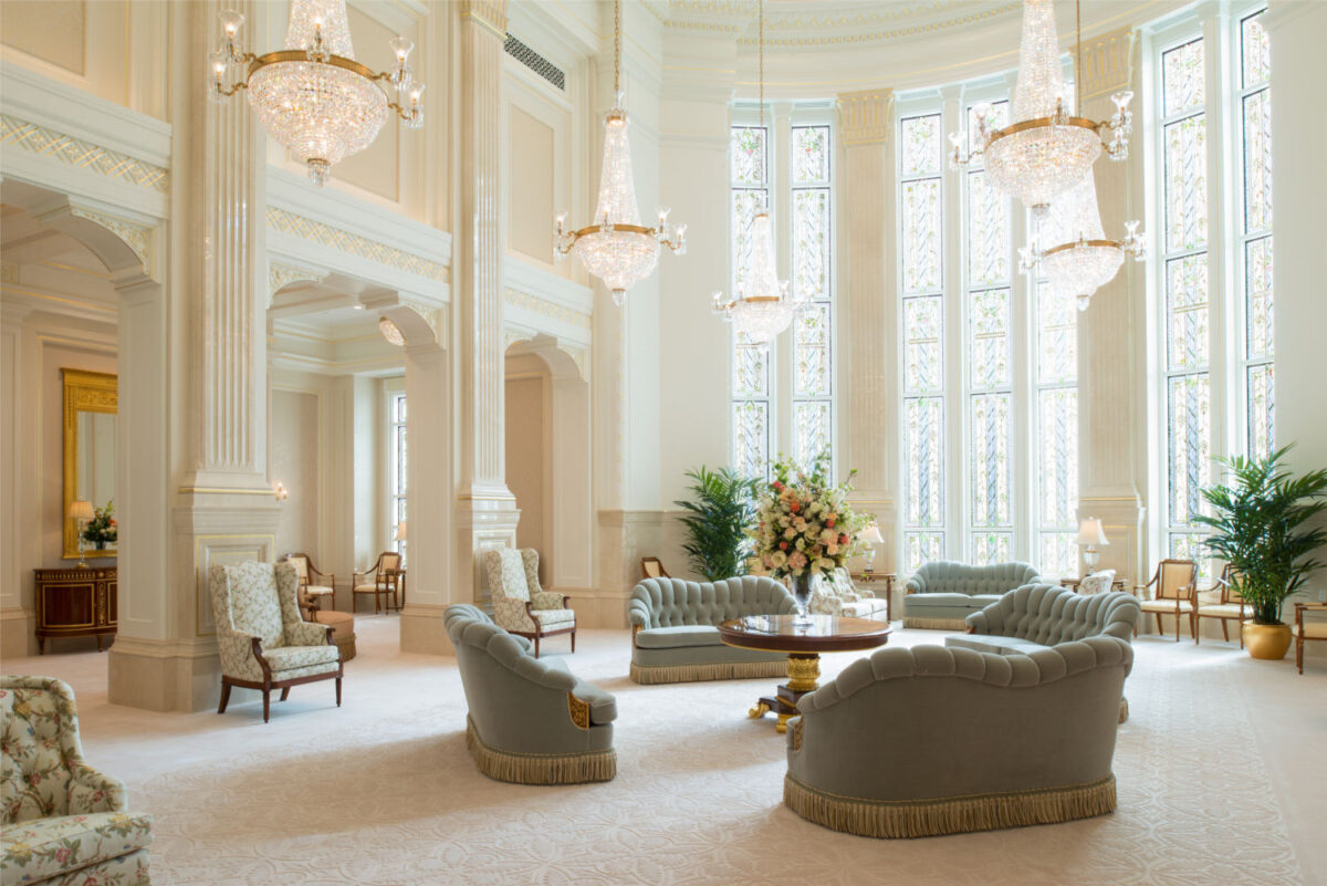 The décor, while not overdone, is ornate, calming and peaceful. Several tufted couches and chairs in green, tapestries and golds are in the room. The detailed carpet is a light cream. Two-story, stained-glass windows and interior walls and ceiling continue the apple blossom theme, but unlike the other levels the flowers are in full bloom.