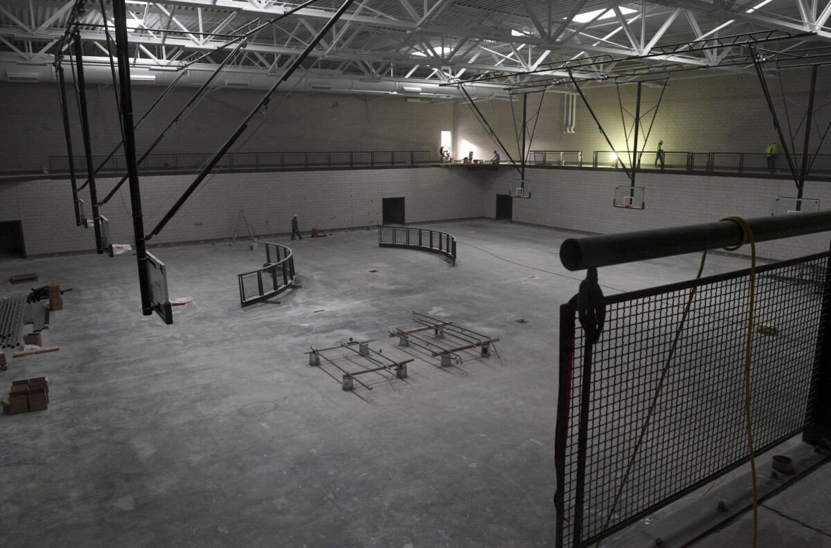 The P in the middle of the gym floor will be cut out and placed in the new building. Some senior class gifts, like the bronze bulldog, will also be moved to the new school.
