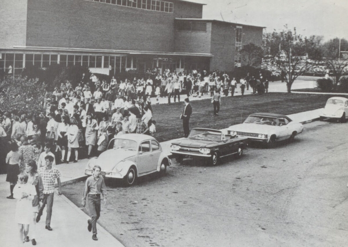 A photograph of students outside Provo High School in 1970.