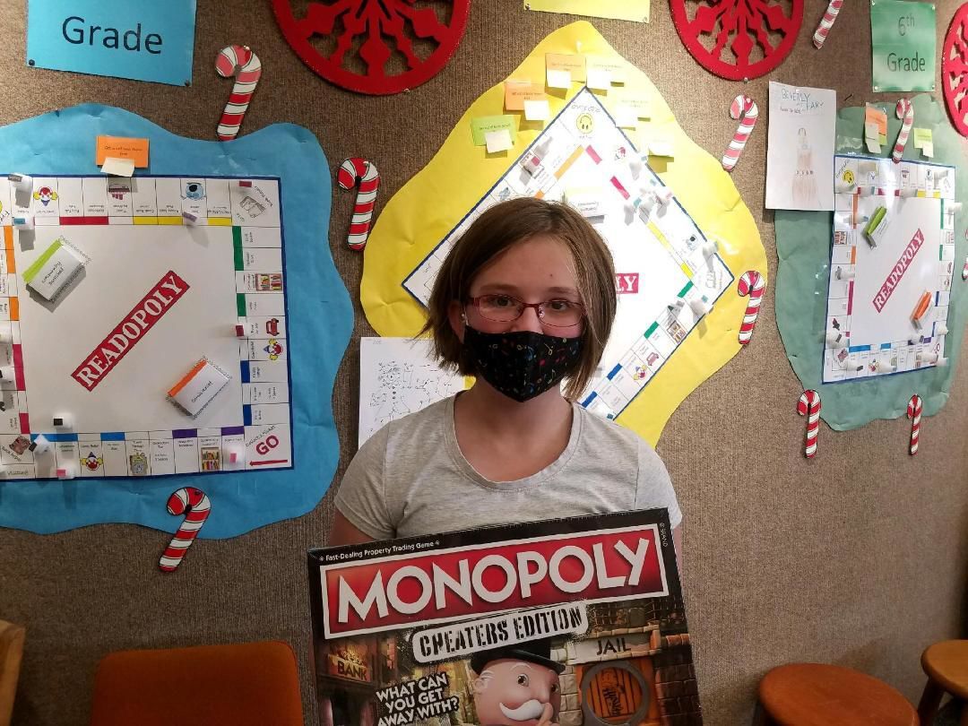 The winners are: 4th grade, Tanner Mickel; 5th Grade, Kandalyn Mickel; and 6th Grade is Amelia Hinckley. They each got a box of candy and a Monopoly Game.