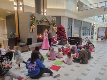 - Children gather for a special story time in the mall, where Mrs. Claus reads a book and is joined by special guests like princesses and other festive characters.