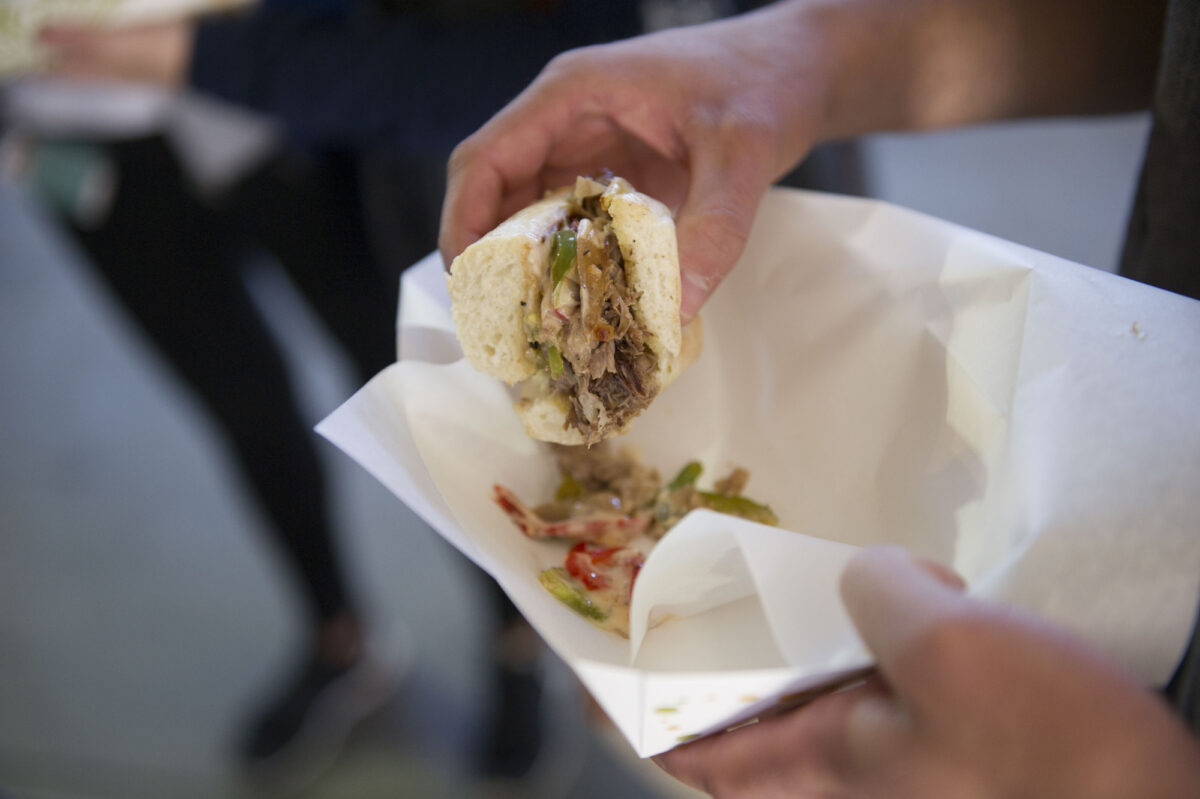 The Philly Cheesesteak vendor booth goes for extra points with the cheese it uses. Premium white cheese sauce is drizzled over chopped streak seasoned with Montreal steak seasoning that’s mixed with fajita veggies on a good-and-solid hoagie roll.