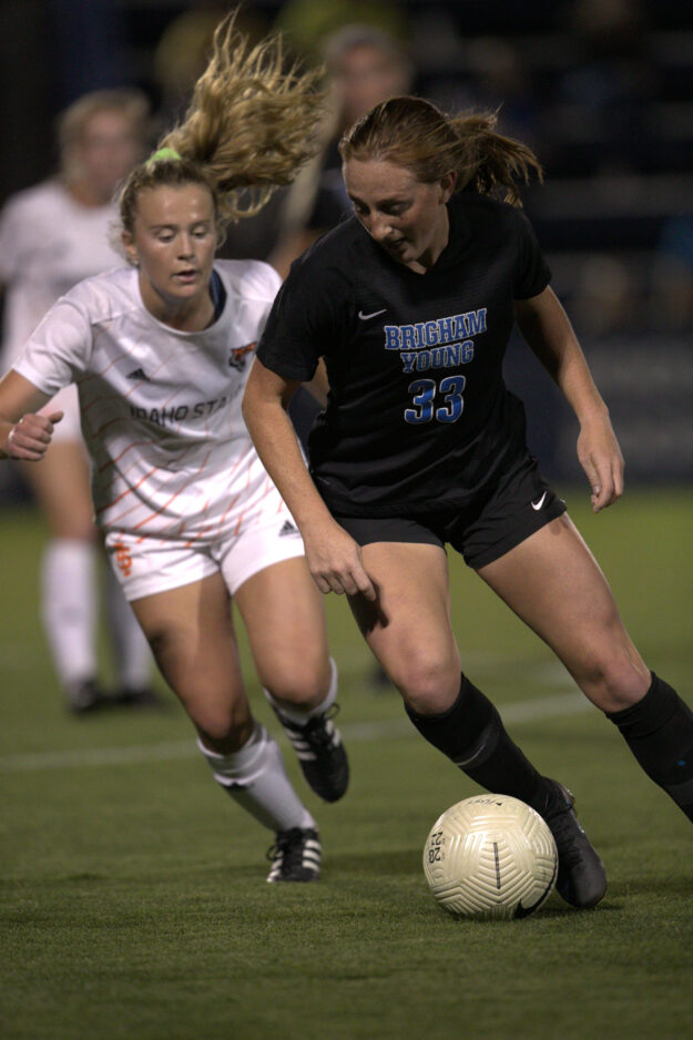 BYU’s Rachel McCarthy (in black) dribbles the ball against Idaho State in a women’s college soccer match at South Field on Thursday, Sept. 16, 2021. (BYU Courtesy Photo)