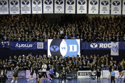 BYU’s student cheering section, “The ROC” (Roar of Cougars) came heavy to the Smith Fieldhouse on Friday for the No. 10 Cougars matchup with Duke, donning t-shirts that read “Welcome to the Party.”
