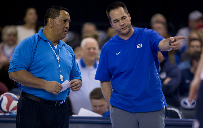 Brigham Young University head coach Shawn Olmstead talks with an official during the Cougars' season-opener against the Ohio State Buckeyes held Thursday, Jan. 10, 2019, at Smith Fieldhouse in Provo. Isaac Hale, Daily Herald