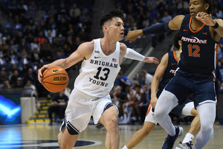 BYU senior Alex Barcello (left) dribbles up the court during the WCC game against Pepperdine in the Marriott Center on Saturday, Feb. 26, 2022. (Harold Mitchell, Special to the Herald)