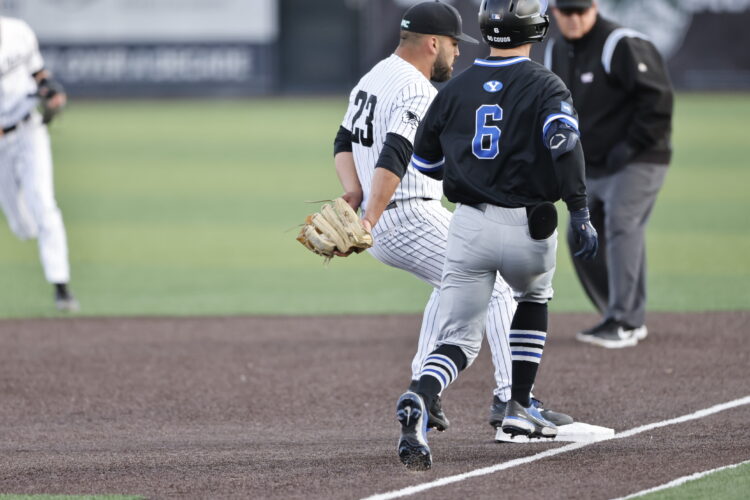 BYU pitchers held UVU without a hit until the bottom of the fifth when Kayler Yates doubled to left off of Carter Smith. Copper Hansen followed with a hard shot over the center fielder’s head for a triple to score Yates and get the home team on the board.
