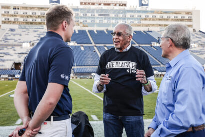- A member of the “Black 14” talks to BYUtv’s Spencer Linton before the start of a game against Wyoming at LaVell Edwards Stadium on Saturday, Sept. 24, 2022.