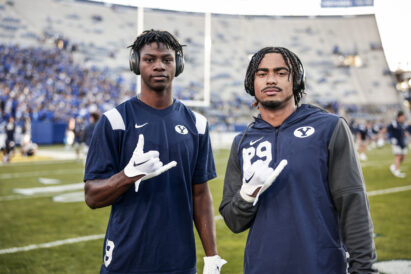 - Two BYU football players pose for a photo before a game against Wyoming at LaVell Edwards Stadium on Saturday, Sept. 24, 2022.
