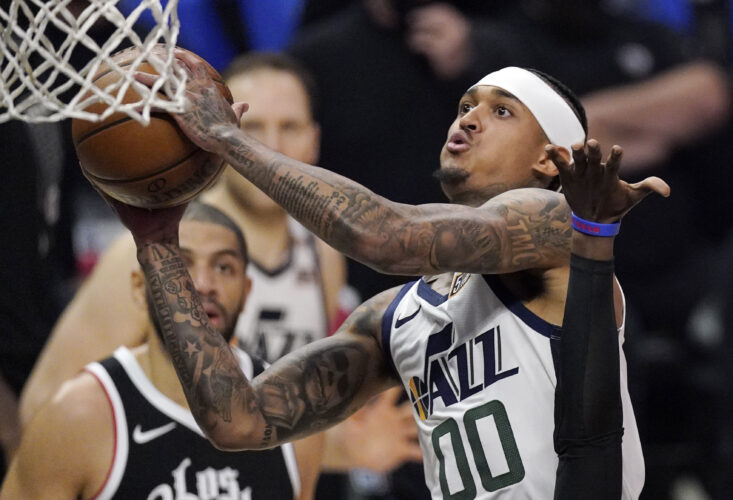 Utah Jazz guard Jordan Clarkson, right, shoots as Los Angeles Clippers forward Nicolas Batum, left, watches during the first half in Game 6 of a second-round NBA basketball playoff series Friday, June 18, 2021, in Los Angeles.