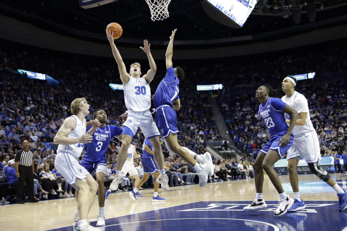 - BYU’s Dallin Hall (30) goes up for a shot against Georgia State during a men’s college basketball game at the Marriott Center on Saturday, Dec. 16, 2023.