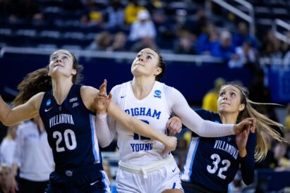 - BYU’s Lauren Gustin (center) fights for position against two Villanova players in Ann Arbor, Mich., during the NCAA Women’s Basketball Tournament on Saturday, March 19, 2022.