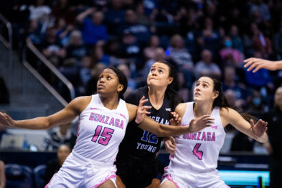 - BYU’s Lauren Gustin (center) fights for position against two Gonzaga players during a women’s college basketball game against Gonzaga on Saturday, February 19, 2022.