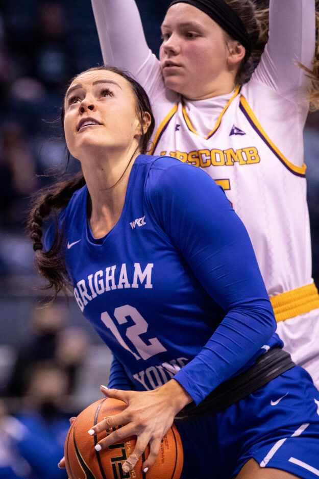 - BYU’s Lauren Gustin prepares to go up after getting an offensive rebounds in a women’s college basketball game against Lipscomb on Tuesday, November 9, 2021.