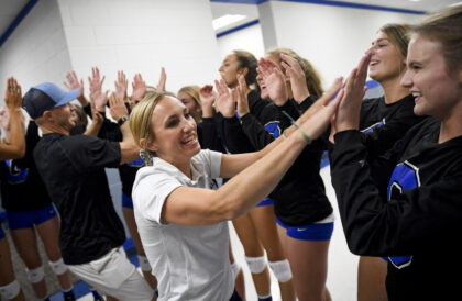 Pleasant Grove head coach Allyce Jones high-fives her players before a game between the Pleasant Grove Vikings and the Lone Peak Knights held Wednesday, Sept. 5, 2018, at Pleasant Grove High School. Isaac Hale, Daily Herald