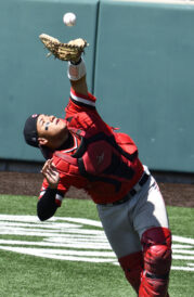 - American Fork senior catcher Josh Rojas snags a foul ball during Game 2 of the 6A championship series against Skyridge at UCCU Ballpark in Orem on Saturday, May 27, 2023.